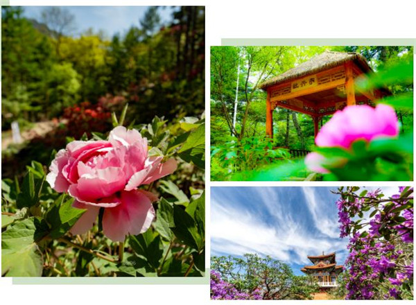 高山牡丹和杜鵑花正值花期,在枝頭開得爛漫,在森林氧吧的綠意襯托下,顯得愈加?jì)善G明媚。