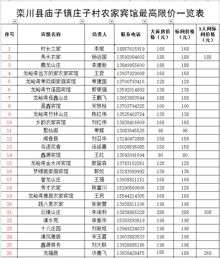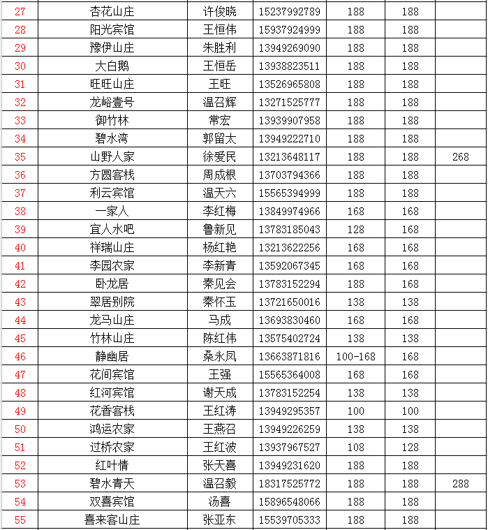 欒川縣廟子鎮(zhèn)莊子村農(nóng)家賓館最高限價(jià)一覽表: