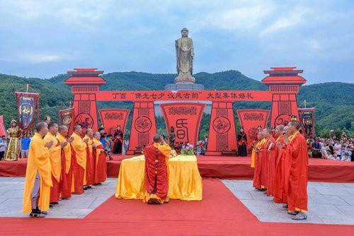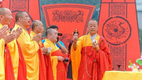 佛泉寺的法師率僧眾為新人們虔誠誦經(jīng)、叩拜、灑凈,祈愿新人諸事吉祥,一生平安幸福。