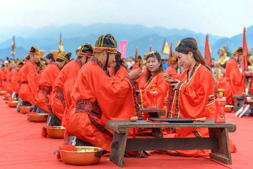 婚禮現(xiàn)場,氣勢恢宏,場面壯觀。婚禮分為《開禮篇》《主禮篇》、《贊禮篇》三部分,采用古典婚禮的儀式與場景,再現(xiàn)漢代禮樂與婚慶文化。近百對新人,30位旗手、12位鼓手、15位舞者、6位侍女,在大主禮司、大領(lǐng)禮司、執(zhí)禮官帶領(lǐng)下,在6對金婚老人的見證下,伴隨著古樸典雅的音樂,典禮開始,《開禮篇》以華章呈現(xiàn)、盛世起舞開篇,再現(xiàn)古風(fēng)古韻之魅力;《主禮篇》分為雅樂起鼓(鼓樂齊奏,盡顯漢風(fēng)威儀)、盛世宣召(華章贊頌,禮樂相和,旗幡招展)、新人召進(jìn)(君子翩翩,裙帶華簪,以禮而入)、正衣肅顏(敬畏天地,文化彰顯)、沃盥禮敬(凈手素面,禮敬先賢)、對席起禮(長案對坐,四目期盼)、同牢合巹(三牢而食合巹而飲同甘共苦比翼齊肩)、交拜成儀(夫婦交拜,互敬款款)、解纓結(jié)發(fā)(結(jié)發(fā)成儀,夫婦百年)、執(zhí)手禮成(執(zhí)子之手,與子偕老)等十個(gè)環(huán)節(jié),無一不體現(xiàn)漢式傳統(tǒng)婚典文化的獨(dú)特魅力!