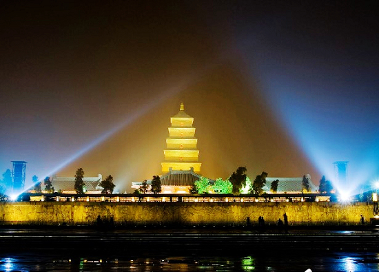 大雁塔位于南郊大慈恩寺內(nèi),被視為古都西安的象征。相傳是唐僧從印度(古天竺)取經(jīng)回來后,專門從事譯經(jīng)和藏經(jīng)之處,因仿印度雁塔樣式的修建故名雁塔,F(xiàn)有的大雁塔是一座典型的樓閣式方形錐狀磚塔,塔分七層,通高64米,由青磚磨磚對縫砌成。華燈初下,北廣場上音樂噴泉升起,與白天的神圣厚重形成了一番強烈的對比。