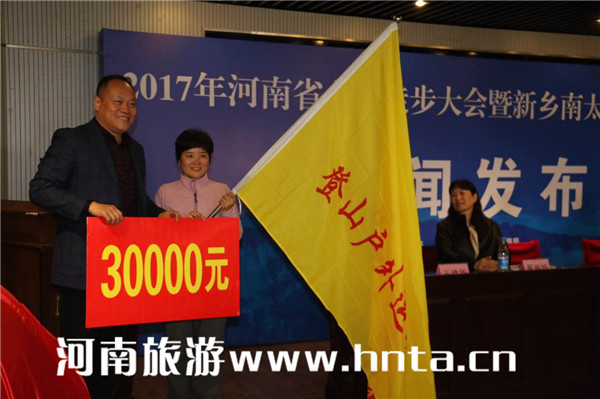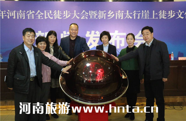 發(fā)布會上,省旅游局旅游促進(jìn)處處長湯雁、省社會體育管理中心主任陳真分別致辭,新鄉(xiāng)南太行旅游有限公司總經(jīng)理王紅昌介紹新鄉(xiāng)南太行概況及活動組織情況。此外,發(fā)布會還進(jìn)行了一項特別的儀式,省體育局群體處處長趙峻為河南登山愛好者、曾積極參與登山營地救援工作的醫(yī)務(wù)工作者董麗麗同志進(jìn)行了授旗。最后,省旅游局旅游促進(jìn)處處長湯雁、省體育局群體處處長趙峻、省社體中心主任陳真、新鄉(xiāng)市外事僑務(wù)旅游局局長崔紅、新鄉(xiāng)市體育局副局長王建華、新鄉(xiāng)南太行旅游有限公司總經(jīng)理王紅昌共同觸摸啟動球,宣告2017年河南省全民徒步大會暨新鄉(xiāng)南太行崖上徒步文化年活動開幕。