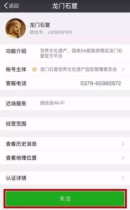 1、首先打開微信,掃描福道兩旁牌子上的“微信猜燈謎”活動二維碼,點(diǎn)擊關(guān)注龍門石窟官方微信。