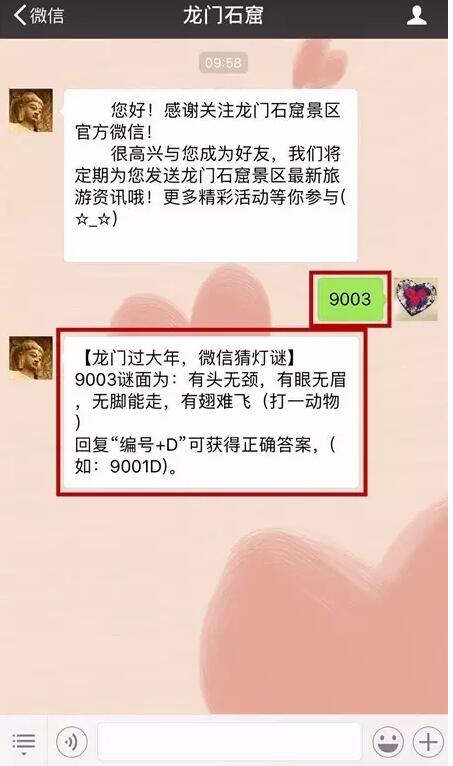 2、輸入相對應(yīng)的燈謎數(shù)字代碼,發(fā)送至龍門石窟官方微信平臺,以獲得相對應(yīng)的謎面,so easy!