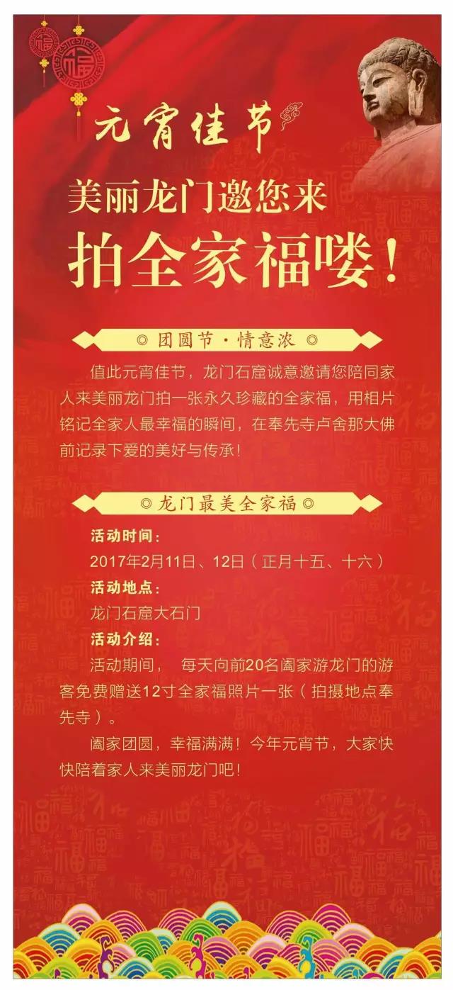 除此之外,正月十五、十六(2月11日、12日)還有免費(fèi)為游客朋友拍攝“龍門最美全家福”的活動(dòng),屏幕前的您快快陪同家人,一起來美麗龍門拍張幸福的全家福,共享團(tuán)圓佳節(jié)吧!