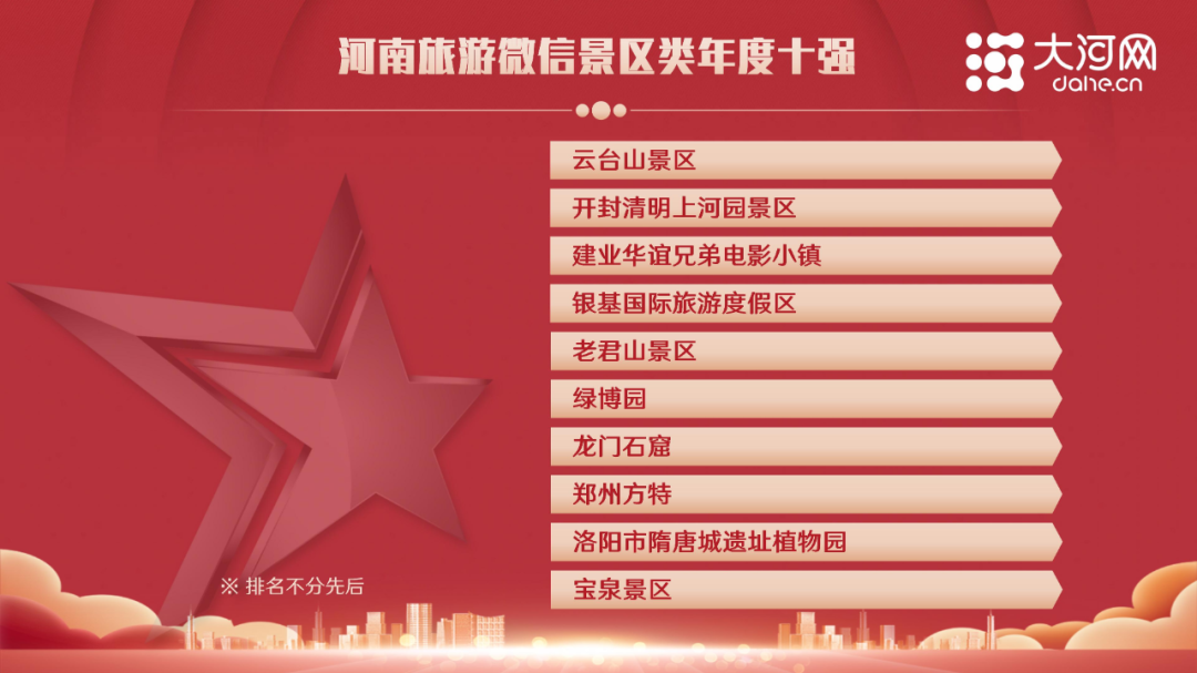 河南旅游微信景區(qū)類年度十強(qiáng)公眾號:云臺山景區(qū)、開封清明上河園景區(qū)、建業(yè)華誼兄弟電影小鎮(zhèn)、銀基國際旅游度假區(qū)、老君山景區(qū)、綠博園、龍門石窟、鄭州方特、洛陽市隋唐城遺址植物園、寶泉景區(qū)。