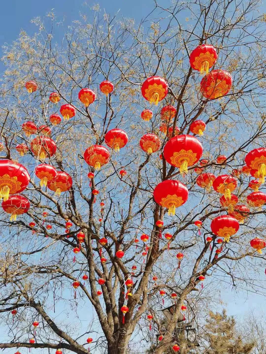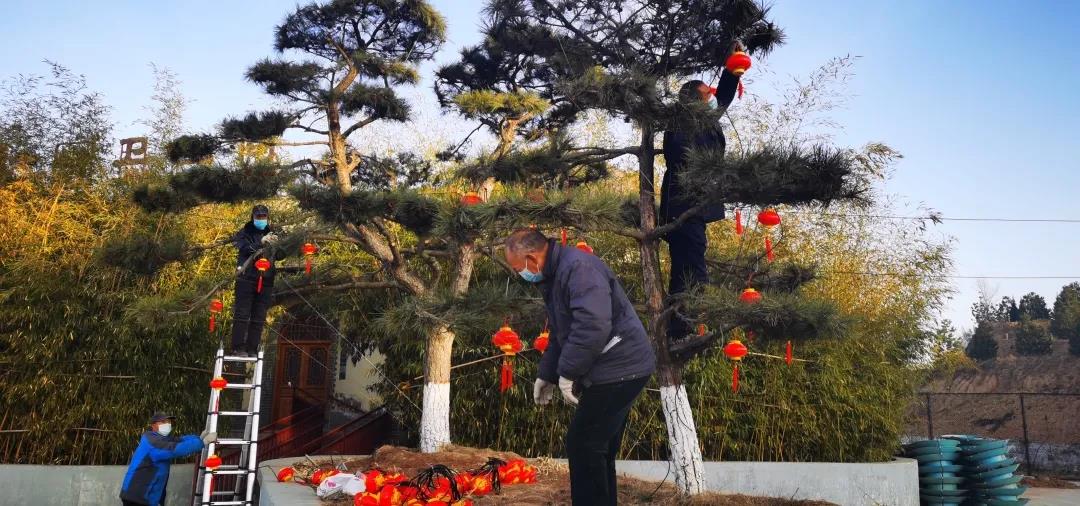 景區(qū)入口處南平門北安門墻壁上,已經(jīng)掛滿了紅彤彤的燈籠,成片的燈籠展現(xiàn)了古村獨(dú)特的魅力,也勾勒出了地坑院紅紅火火的年味。走入景區(qū),隨處都可看到工人師傅們,冒著寒風(fēng)正在有條不紊地焊鐵架、掛燈籠,修樹枝,扮花樹,調(diào)試電路?此坪(jiǎn)單的流程背后,極其精細(xì)又繁瑣,一顆顆大樹小樹在師傅們的辛苦付出下,都掛上了一個(gè)個(gè)大小各異的紅燈籠和一簇簇嬌艷的花枝,在微風(fēng)中隨風(fēng)飄逸,與古樸的村落交相輝映,顯得格外喜慶!