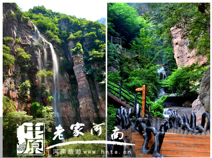 巨峰對峙,直插云端,谷深且長,綿延向天的天路奇觀,再多的驚嘆與形容,都無法訴說你的美!令人震撼是天路上的瀑布,伸手就可以觸摸得到,在你與水石的親密接觸中,你身心的悸動和快樂是無法言述的,陽光明媚,萬里無云,瀑布好似一條白龍,瀑布的流水在陽光下好像是閃亮的珍珠,如煙如霧的水絲飄在臉上,脖子里,涼絲絲舒服極了。