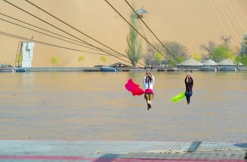 孤柏渡的“飛黃騰達(dá)”全長(zhǎng)2000余米,高低落差達(dá)58米,瀕臨黃河,背臨著沙漠的河口,是目前國(guó)內(nèi)黃河流域最長(zhǎng)的飛索,項(xiàng)目將于8月中旬在孤柏渡景區(qū)投入運(yùn)營(yíng)。坐上“飛黃騰達(dá)”,從黃河的一邊飛越到另一邊,只需短短的1分鐘時(shí)間,就能橫跨黃河,飛到對(duì)岸。飛渡黃河的過程中,背對(duì)浩瀚沙漠,腳踩滾滾黃河水,體驗(yàn)壯哉河山文化。乘著飛索感受耳邊風(fēng)聲嚦嚦,用飛翔擁抱藍(lán)天?偸橇w慕古人輕功瀟灑,這會(huì)兒通過飛黃騰達(dá)黃河飛索,也能過把癮了。
