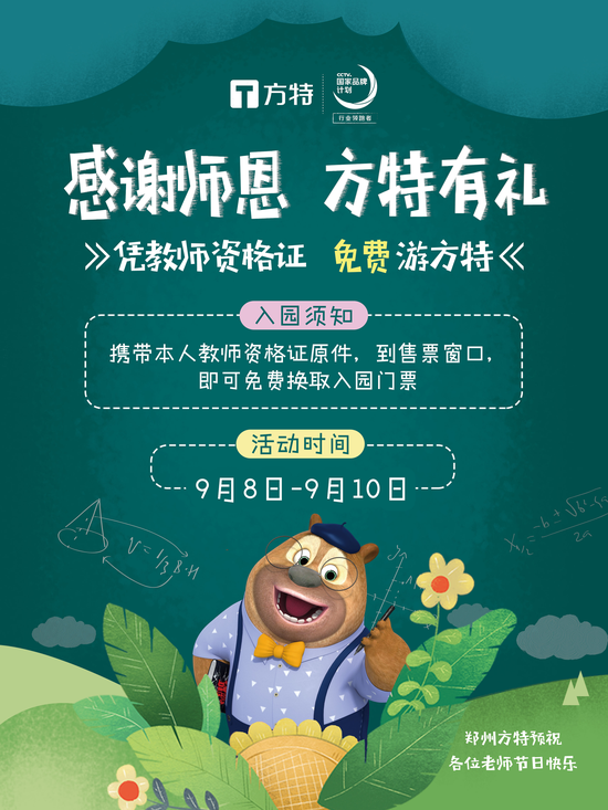 曾經(jīng)的9月10日,是我們?cè)诤诎迳蠟槔蠋熣J(rèn)真寫下的“節(jié)日快樂”,是早上見到老師時(shí)送上的一聲親切問候,是悄悄放在老師辦公桌上的一張節(jié)日賀卡。在第34個(gè)教師節(jié)到來之際,為了進(jìn)一步弘揚(yáng)尊師重教的光榮傳統(tǒng),表達(dá)對(duì)廣大老師的崇高敬意,鄭州方特旅游度假區(qū)特別推出教師節(jié)專屬免票福利,以此來感謝每一位在講臺(tái)上辛勤耕耘的園丁!