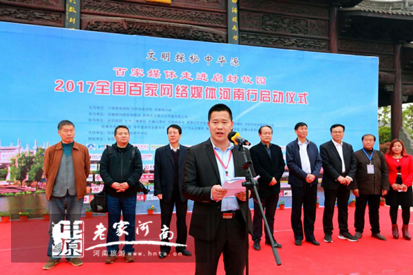 在啟動儀式上,開封旅游委副主任張克彬先生致歡迎辭。張克彬在致辭中講到,開封是中國八大古都之一,迄今已有4100年的建城史,先后有八個朝代在此建都,開封也是國家歷史文化名城、中國書法名城、中國菊花名城、中國收藏文化名城、中國優(yōu)秀旅游城市、全國旅游標準化示范城市。全市擁有國家5A、4A級旅游景區(qū)7個。這次百家網(wǎng)絡媒體河南行走進啟封故園采風報道,能極大的提升景區(qū)的知名度和影響力,讓更多的人了解開封,關注啟封,將發(fā)揮重要的作用。