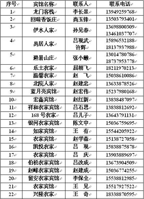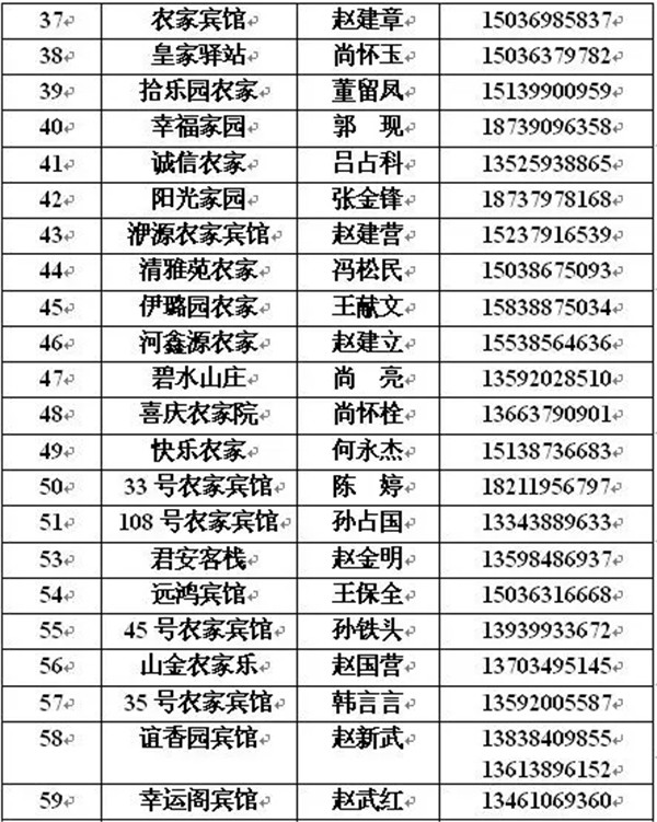 由于山上景區(qū)內(nèi)酒店接待量有限,如果您在山上的酒店沒(méi)有訂到房間不要緊,山下銅河游客服務(wù)中心附近農(nóng)家賓館接待量相當(dāng)大,請(qǐng)各位游客朋友不要擔(dān)心,下面是銅河游客服務(wù)中心附近部分賓館的聯(lián)系方式: