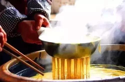 趁熱倒進(jìn)一特制的漏斗盆里,鍋里或盆里提前防好清水。此時(shí)必須是二人操作,一人端盆,一人用勺子使勁擠壓漏盆,順漏斗擠壓出來,就變成了一個(gè)個(gè)小蝌蚪、小魚魚。然后再把這些魚魚撈在碗里澆上提前配置好的漿水湯,味道十分鮮美,且清涼可口,夏天吃之,十分舒服,冬天也可熱吃。