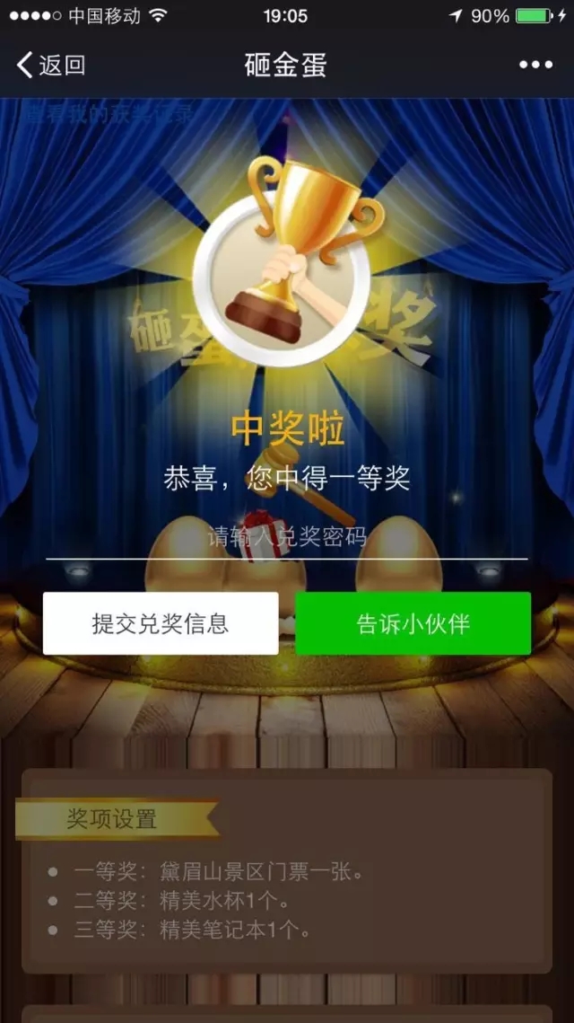 第三步:停留到兌獎頁面,需到黛眉山由工作人員輸入兌獎碼兌換相應獎品,方可參與下次砸金蛋