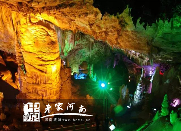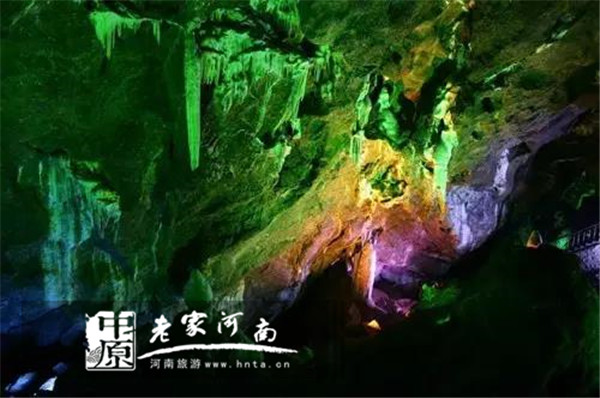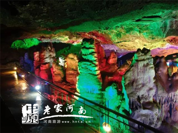 溢彩殿,是雞冠洞中第二大景點,這里洞頂懸掛著鐘乳石,地上長著石筍,密密麻麻,流光溢彩。此廳峽谷狀,地勢開闊,彎彎曲曲的臺階路(垂直高度120米)通往第三大廳,幽深神秘。