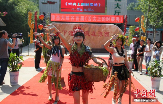 9月5日,導(dǎo)游身披山珍、野果、草藥等做成的“時(shí)裝”進(jìn)行走秀。當(dāng)天,三門峽豫西大峽谷上演了一場由土特產(chǎn)制作而成的“舌尖上的時(shí)裝秀”,辣椒帽、石榴裙、葡萄項(xiàng)鏈等等紛紛登場亮相,吸引眾多游客駐足欣賞。