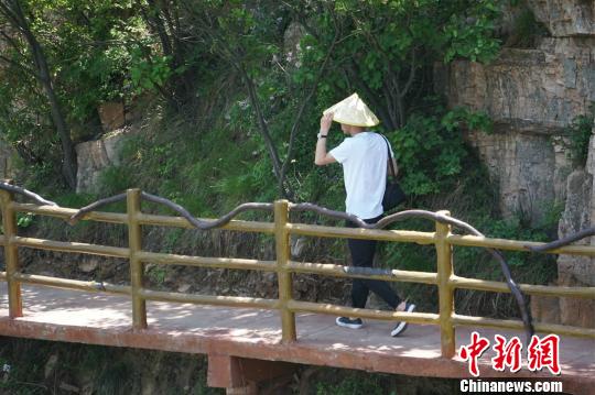 圖為翟傳鳴筆下的魯山阿婆寨,一游人在棧道上經(jīng)過!《w 攝