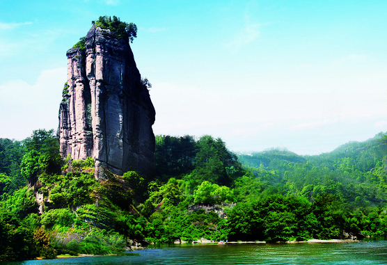 武夷山的三十六峰,最著名的有大王峰、玉女峰和天游峰。大王峰屹立在九曲溪口,陡壁如削,就像是擎天巨柱一般,屹然高聳,顯得極為雄偉壯觀,古人認為它具有王者的威儀,因而將它命名為大王峰。此峰四面都是無徑可登的峭壁,只有南面,從一條直上直下的巖石裂縫中,攀梯而上,過此險處,就有盤旋的山路直通峰頂,當中還有幾個險處,而這些山路,是后人不斷地修砌成的。大王峰頂,古木參天。在這里縱目四望,奇峰環(huán)拱,曲水回流,景色壯麗。玉女峰是一座秀麗的山峰屹立溪邊,遠看宛如亭亭玉女,觀之可親。天游峰被認為是武夷第一勝地。這里是觀賞九曲山水全景最好的地方。