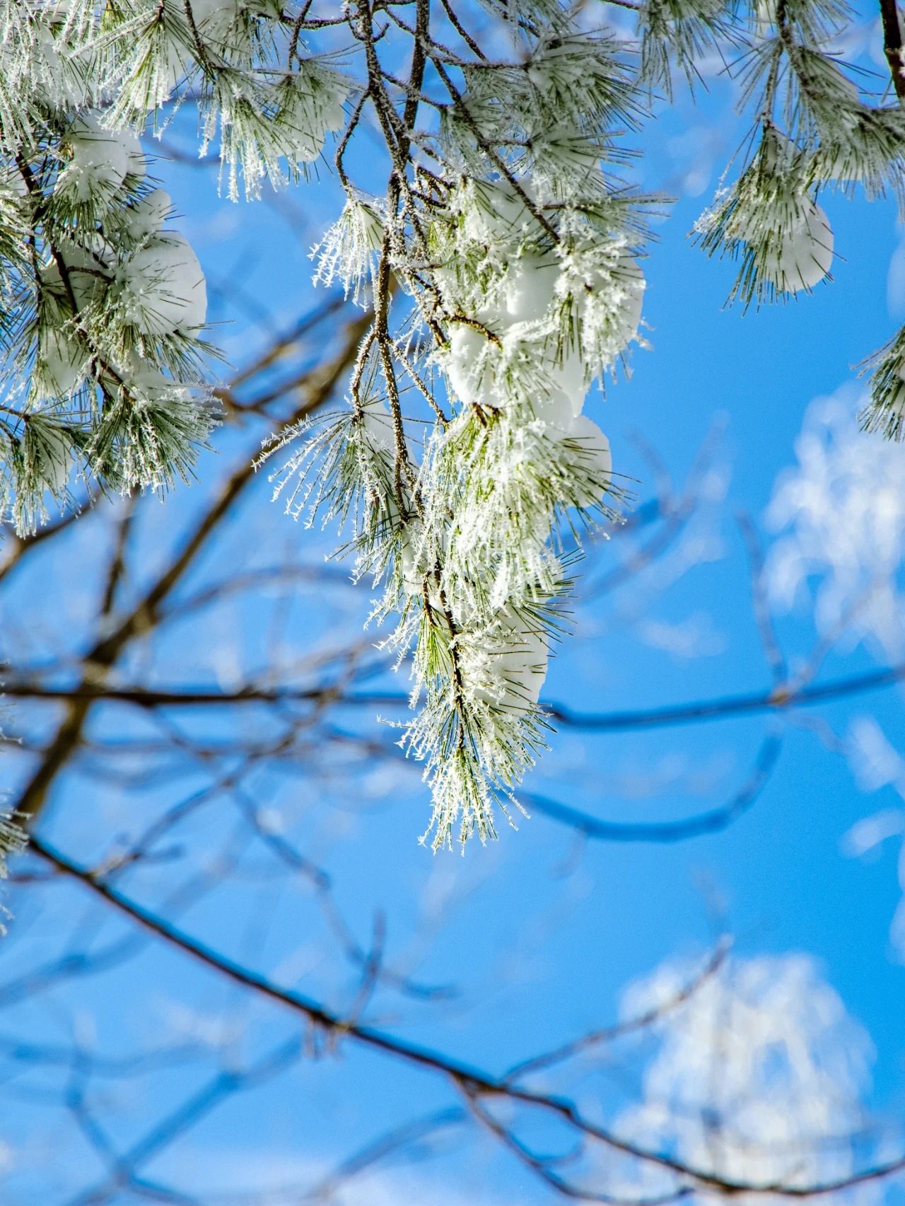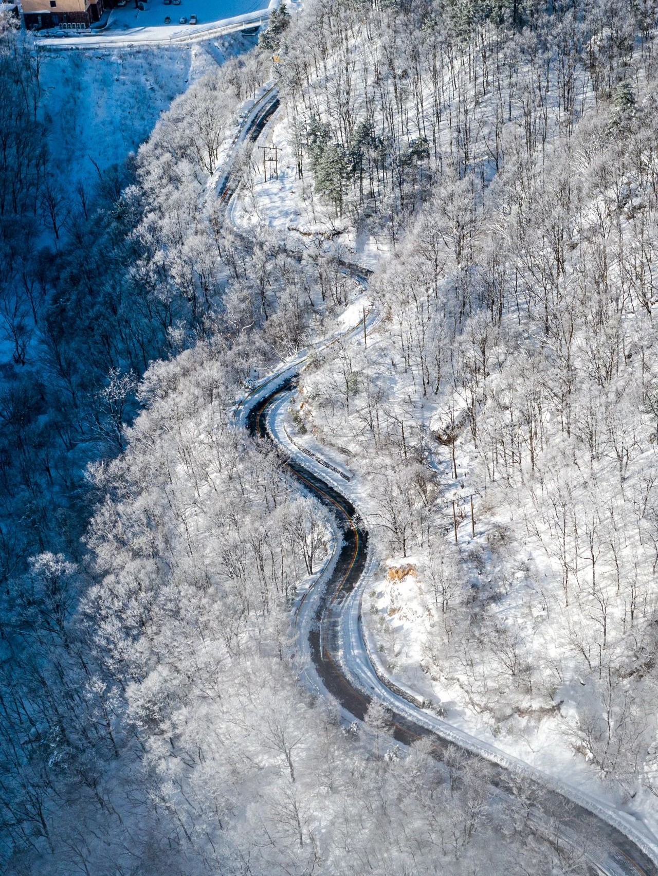 美不勝收的人間仙境實至名歸,一場紛揚大雪迅速染白白云天路,樹枝上的積雪閃著晶瑩的白光。