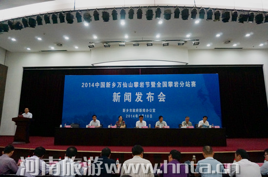 6月18日,2014中國新鄉(xiāng)萬仙山攀巖節(jié)暨全國攀巖分站賽(河南新鄉(xiāng)站)新聞發(fā)布會在新鄉(xiāng)市政府綜合辦公樓一樓報告廳舉行。國家體育總局登山運動管理中心攀巖攀冰部丁祥華主任、新鄉(xiāng)市政府周世杰市長以及新聞媒體記者蒞臨此次新聞發(fā)布會。
