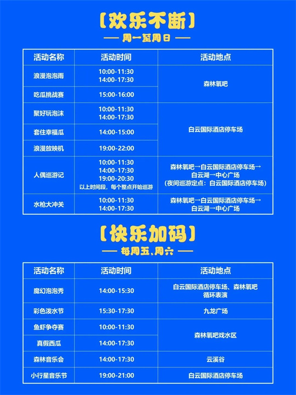 浪漫泡泡雨/水搶大沖關/聚好玩泡沫/人偶巡游記/吃瓜挑戰(zhàn)賽/套住幸福瓜/浪漫放映機……