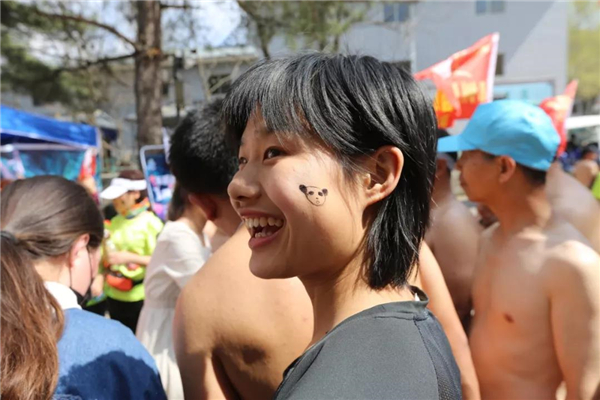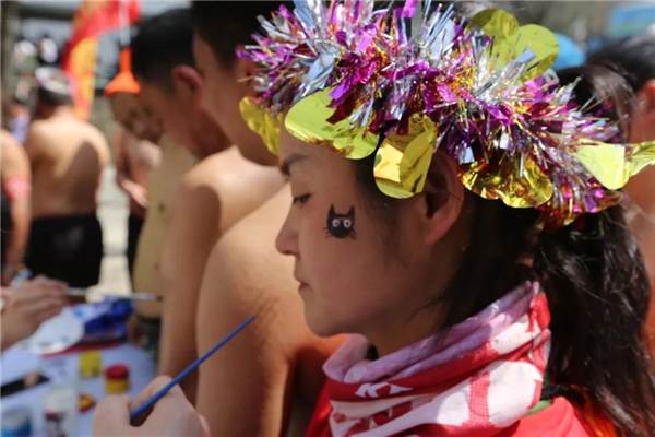 活動開始時,各地選手按要求就位,進入換裝區(qū)換裝備戰(zhàn)。男選手光著上身,只穿一件短褲,裸露的身體畫有大熊貓、小豬等各種卡通彩繪,頭戴五顏六色的假發(fā)套,讓人忍俊不禁;美女選手盡顯曼妙身材魅力。比賽現(xiàn)場,吸引了萬余名游客參與觀戰(zhàn),氣氛熱烈。