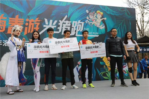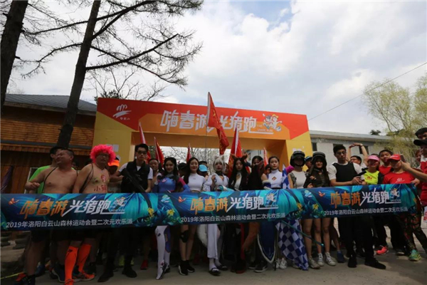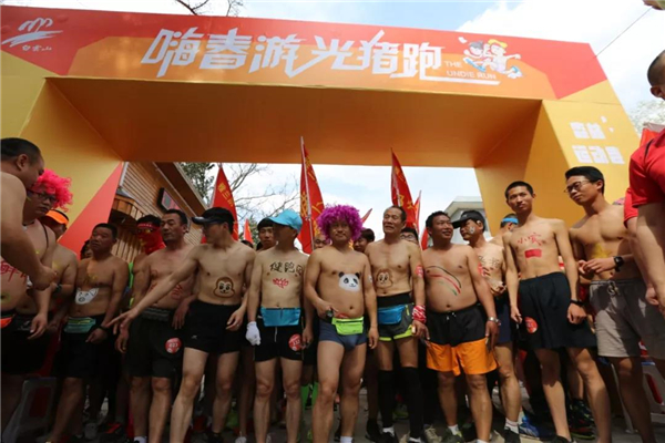 森林氧吧內(nèi),樹青草綠,環(huán)境宜人。各地慕名而來的游客就在彩門前等候,都想一睹“光豬跑”的精彩一幕。來自鄭州等地的光豬跑選手,穿著短褲體恤,手舉各色旗幟,進入現(xiàn)場。