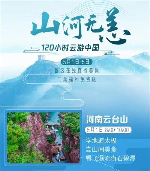 5月1日上午8:00,云臺(tái)山聯(lián)合騰訊開(kāi)展120分鐘的“山河無(wú)恙 云游云臺(tái)山”直播活動(dòng),帶廣大網(wǎng)友線上云游云臺(tái)山初夏好風(fēng)光,吸引了近20萬(wàn)游客同時(shí)在線觀看。