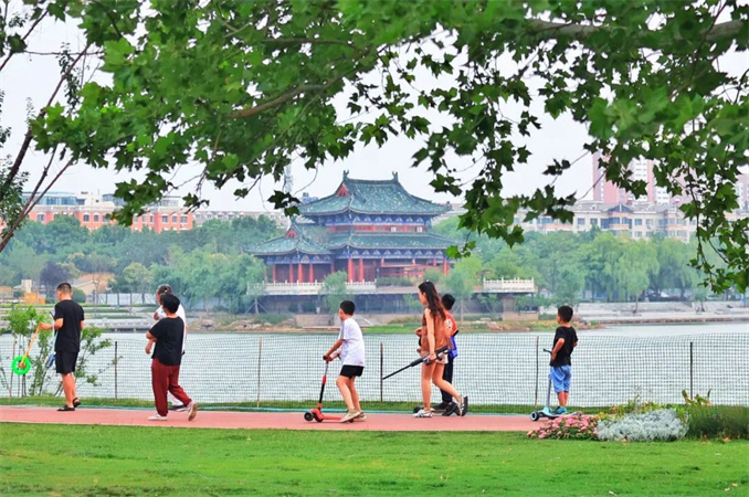 炎炎夏日,一條條游船穿梭在剛改造提升的包公湖、御河、龍亭湖之間,游客們不但涼爽愜意,還欣賞到兩岸美景、宋式橋梁。“通過近年來的水系連通綜合治理,開封已經(jīng)實現(xiàn)了古城環(huán)城水系的華麗蝶變。”開封市水利局二級調(diào)研員崔鼎新介紹,他們在老城區(qū)構(gòu)建“六河連五湖”,在新區(qū)構(gòu)建“一湖兩區(qū)三橫四縱”的水系網(wǎng)絡(luò)格局,逐步變?nèi)彼疄橛兴、變污水為清水。平日里岸邊都是市民休閑納涼的主題公園,汛期城區(qū)水系則成為防洪排澇的“安全網(wǎng)”。