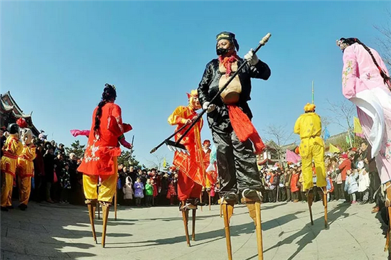 表演特點:“捷足居然逐隊高,步虛應(yīng)允快聯(lián)曹。笑他立腳無根據(jù),也在人間走一遭。”節(jié)日期間,男女老少,身著花花綠綠的衣裳,雙腿綁在高蹺上,雙手舞扇,盡情表演,湊興取樂。