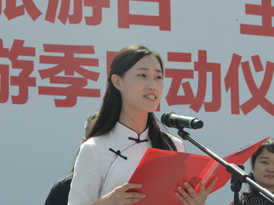 △ 鞏義市優(yōu)秀導(dǎo)游員付瑞媛宣讀《文明旅游倡議書》