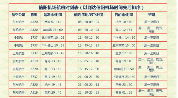 通航初期,明港機(jī)場將開通北京南苑-信陽-佛山、上海虹橋-信陽-重慶、杭州-信陽-西安航線(每天一班,往返);開通青島-信陽-昆明、哈爾濱-信陽-海口航線(每周一、三、五、七各一班,往返)。
