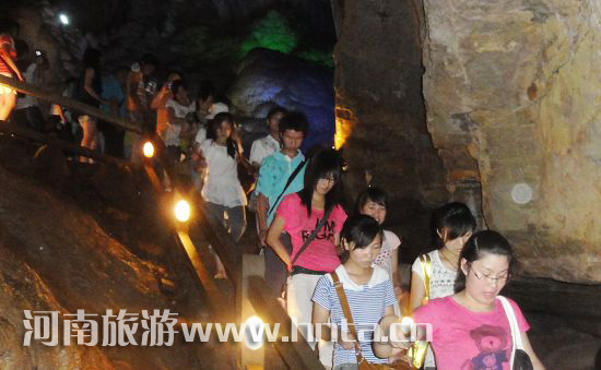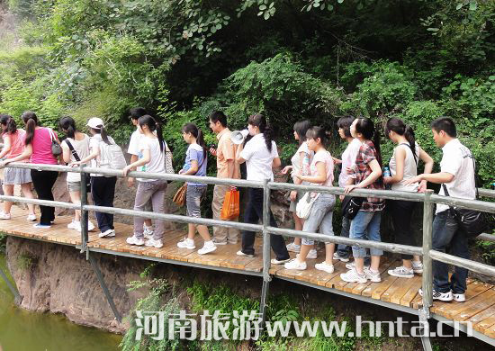 景區(qū)講解員帶領(lǐng)導(dǎo)游們參觀紫龍峽