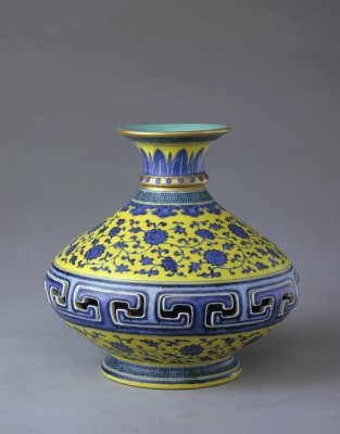 瓶撇口,短頸,扁圓腹,圈足外撇。內(nèi)壁施松石綠釉。外壁通體以黃地青花裝飾?谘叵吕L卷草紋,頸部繪仰蕉葉紋及圓點(diǎn)紋,肩部繪回紋及如意云頭紋。腹部上、下繪纏枝蓮紋,中部為鏤空仰覆勾蓮“T”字形紋。瓶?jī)?nèi)套一小瓶,與外瓶口部相連,可以轉(zhuǎn)動(dòng)。小瓶以紫紅彩為地,上繪梅樹一株。圈足內(nèi)施松石綠釉,署青花篆書“大清乾隆年制”三行六字款。