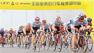 昨日上午,2010年環(huán)球杯業(yè)余自行車聯(lián)賽鄭州站比賽在鄭東新區(qū)舉行,來(lái)自全省的1000多名自行車愛(ài)好者參賽,為綠色鄭州加油助威。
