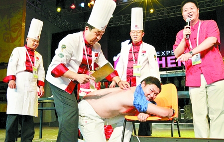 中華(阿五)廚藝絕技表演團(tuán)是中國(guó)成立最早的一支烹飪絕技表演團(tuán)隊(duì),由30余位“身懷廚藝絕技”的烹飪大師組成。在豫菜廚藝絕技表演中,10位烹飪大師現(xiàn)場(chǎng)表演了蒙眼切豆腐絲穿針眼、刀山上切肉絲、人肉砧板、拉龍須面等“獨(dú)門絕技”,讓世界各地的游客近距離感受了中華飲食文化和豫菜精髓。