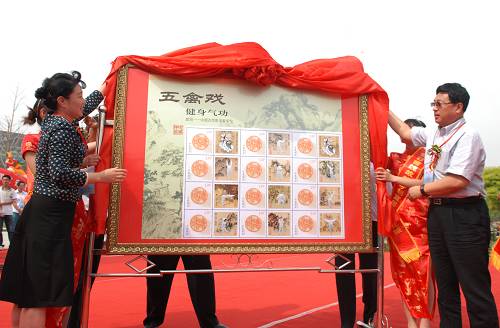 6月1日,中國許昌第三屆三國文化周開幕式暨健身氣功《五禽戲》郵票首發(fā)式在許都公園隆重舉行。圖為國家體育總局黨組成員、局長助理曉敏(左),中華集郵聯(lián)合會副會長劉佳維(右)為健身氣功《五禽戲》郵票揭幕。許昌日報記者朱寧攝