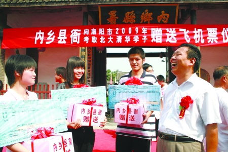 8月11日,內(nèi)鄉(xiāng)縣衙向今年考取清華北大的11名南陽市學(xué)生每人贈(zèng)送南陽到北京的飛機(jī)票、助學(xué)金和有關(guān)書籍。熱心公益事業(yè)特別是尊師重教是內(nèi)鄉(xiāng)縣衙的優(yōu)良傳統(tǒng),5年來已經(jīng)累計(jì)捐資20多萬元資助貧困學(xué)生完成學(xué)業(yè)。
