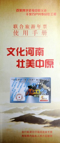 “文化河南•壯美中原”聯(lián)合旅游年票經(jīng)河南省旅游局批準(zhǔn),由河南省旅游局信息中心、齊魯聯(lián)合旅游年票發(fā)行辦公室、陜西旅游年票發(fā)行辦公室共同發(fā)行,實(shí)現(xiàn)了對(duì)河南、山東、陜西以及北京和全國(guó)400家旅游景區(qū)門(mén)票及線路產(chǎn)品的整合,自2009年底在鄭州、許昌、平頂山、新鄉(xiāng)四個(gè)城市試點(diǎn)限量發(fā)行以來(lái)受到社會(huì)的廣泛贊譽(yù),塑造了旅游年票產(chǎn)品在河南市場(chǎng)和群眾中的公信力和良好形象。