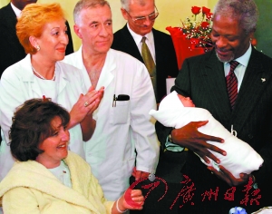 1999年10月12日凌晨0時(shí)2分,時(shí)任聯(lián)合國(guó)秘書長(zhǎng)安南(右)看望成為地球村第60億位居民的男嬰。