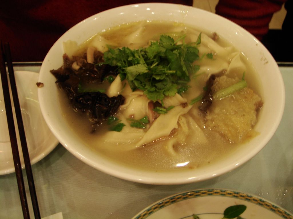 羊肉燴面是一種集葷、素、湯、菜、飯于一體的風(fēng)味小吃。它選用鮮羊肉,經(jīng)反復(fù)浸泡后除凈血污下鍋,撇去血沫,放全大料將肉煮爛,另外將鹽堿兌入面粉和成面團(tuán),反復(fù)抒搓使其更筋,下面時(shí)鍋內(nèi)放原湯,將面拉成薄條后下鍋,放入羊肉、黃花菜、木耳、粉條、青菜,燴熟上桌,外帶香菜、糖蒜,其味更鮮。20世紀(jì)七八十年代,常到鄭州出差的外地人據(jù)此給鄭州送了一個(gè)雅號(hào)——“燴面城”。