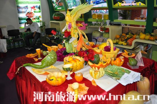 一家瓜果經(jīng)銷商展位前的南瓜宴。桌上每件物品,都是用南瓜雕刻的。