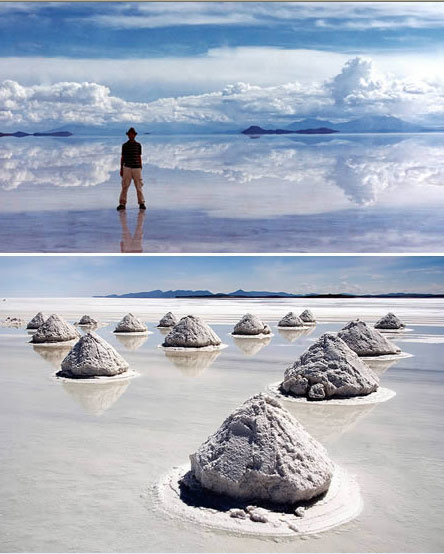 它被稱為的“天空之鏡”。每年冬季,它被雨水注滿,形成一個淺湖;而每年夏季,湖水則干涸,留下一層以鹽為主的礦物硬殼,中部達6米厚。人們可以駕車駛越湖面。尤其是在雨后,湖面像鏡子一樣,反射著好似不是地球上的,美麗的令人窒息的天空景色,這也就是傳說中的“天空之境”。