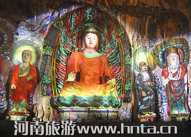 “夜游龍門”從景區(qū)停車場開始,各種燈具將景區(qū)外的生態(tài)停車場、景區(qū)商業(yè)街和景區(qū)綠地照耀得燈火輝煌。進(jìn)入西山窟區(qū)后,賓陽三洞、摩崖三佛、萬佛洞、蓮花洞等主要洞窟內(nèi)金碧輝煌。東山禮佛臺正前方的水中央,九盞蓮花燈玲瓏剔透,大者直徑達(dá)到7米。龍門東山半山腰的香山寺恍如玉宇仙閣。除了燈光藝術(shù)外,龍門景區(qū)夜游項(xiàng)目還有武皇禮佛、琵琶演奏、古箏表演等活動(dòng)。圖為龍門景區(qū)奉先寺盧舍那像龕。