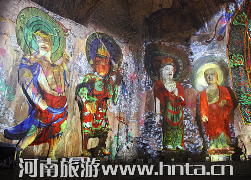 “夜游龍門”從景區(qū)停車場(chǎng)開始,各種燈具將景區(qū)外的生態(tài)停車場(chǎng)、景區(qū)商業(yè)街和景區(qū)綠地照耀得燈火輝煌。進(jìn)入西山窟區(qū)后,賓陽三洞、摩崖三佛、萬佛洞、蓮花洞等主要洞窟內(nèi)金碧輝煌。東山禮佛臺(tái)正前方的水中央,九盞蓮花燈玲瓏剔透,大者直徑達(dá)到7米。龍門東山半山腰的香山寺恍如玉宇仙閣。除了燈光藝術(shù)外,龍門景區(qū)夜游項(xiàng)目還有武皇禮佛、琵琶演奏、古箏表演等活動(dòng)。圖為龍門景區(qū)奉先寺。