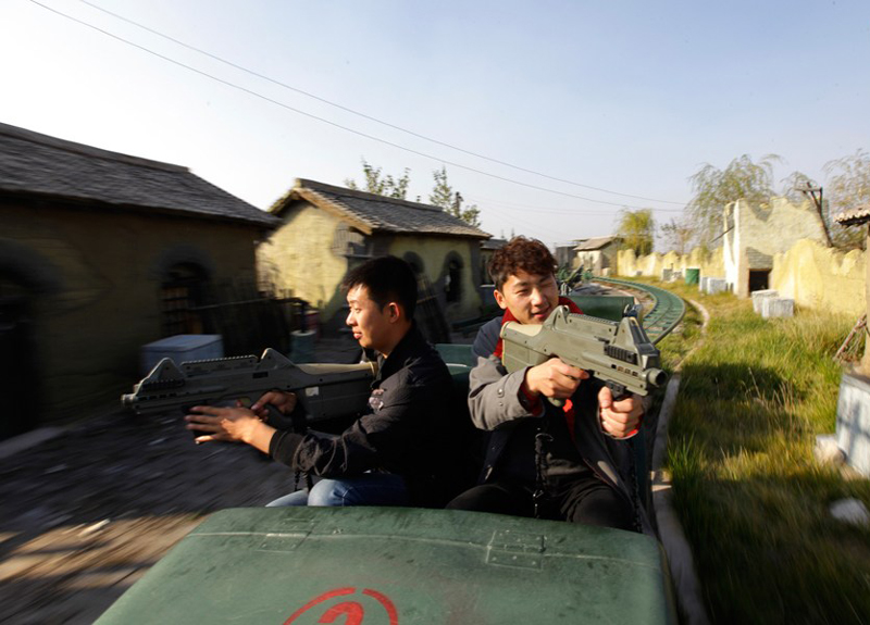 圖為游客坐著游覽車體驗(yàn)戰(zhàn)斗。