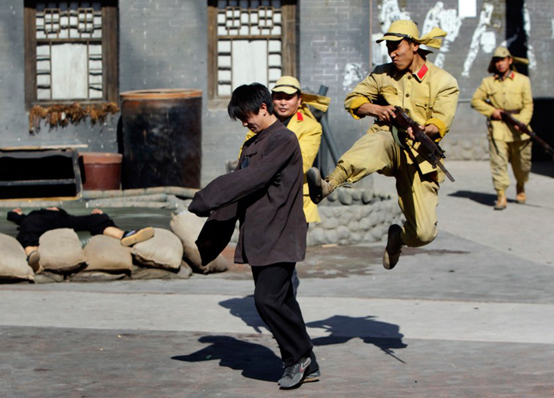 圖為演員在八路軍文化園表演《反掃蕩情景劇》。