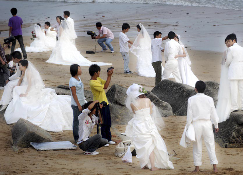 不少新人會(huì)趁長假拍攝婚紗照,但經(jīng)常會(huì)造成“撞車”現(xiàn)象。2008年10月12日,廈門環(huán)島路海邊,一小片沙灘上聚集著二三十對(duì)新人忙碌地?cái)[著造型。