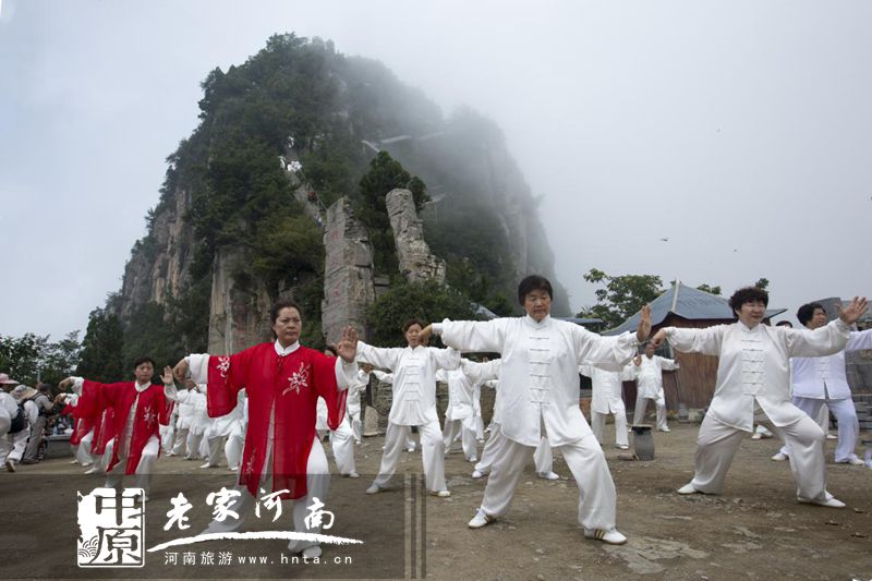 天下第一鐵頂,祈福問道圣地,孕育風光無限,探秘太行圣境。日前,太極高手相聚天界山景區(qū),進行了一場前所未有的立體展演。太極拳、太極劍、太極扇、太極球、太極推手、太極拂塵等傳統(tǒng)太極項目在太行巔峰圣境回龍▪天界山精彩上演。