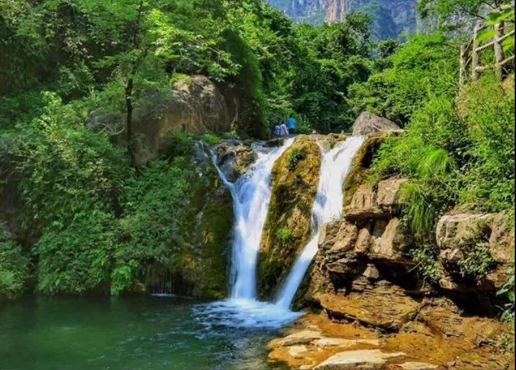 情人瀑,群瀑自高巖跌落,瀑分三層,且每個(gè)斷層都有兩條瀑布相吸相融流入一個(gè)潭里,如情人耳鬢廝磨,竊竊私語(yǔ)。